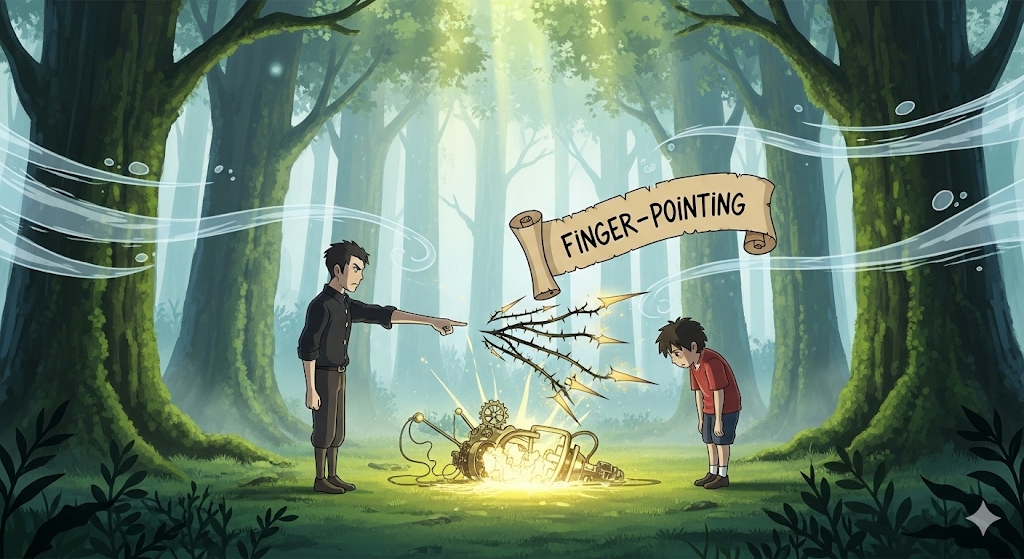 문제(problem)나 실패(failure)가 발생했을 때, '해결책'을 찾기보다 '서로 비난'(point the finger)하고 '책임'을 전가하는 행위를 의미합니다. '갈등(conflict)과 협력(cooperation) **부족'**이라는 부정적인 상황에 초점이 맞춰져 있습니다.
