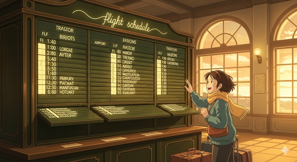 항공편 시간표. 비행기의 출발 및 도착 시간이 정리된 시간표.