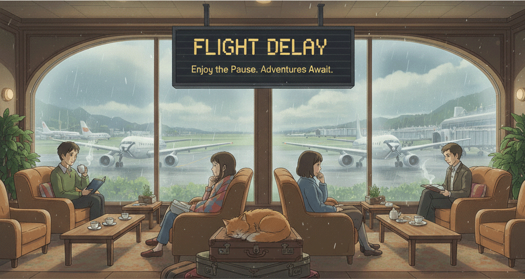 '정해진 시간'에 '지연(delay)하지 않고' 비행기(flight)에 탑승하여 여행(travel)을 시작하는 행위를 의미합니다. '시간 **엄수'**와 '탑승 **성공'**에 초점이 맞춰져 있습니다.