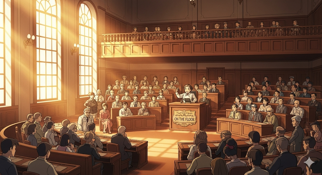 - 해석: 바닥에, (회의 중) 발언권이 있는 상태
