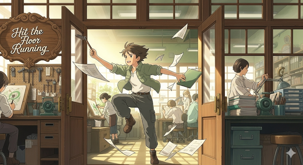 '바닥'(floor)에 도착하자마자 '뛰기'(running)를 시작하는 것처럼, 새로운 직장(job)이나 임무(task)에서 '적응 기간 없이' '즉시 활동적이고 **효율적'**으로 일(work)을 시작하는 행위를 의미합니다. '준비된 상태에서의 신속한 **착수'**에 초점이 맞춰져 있습니다.