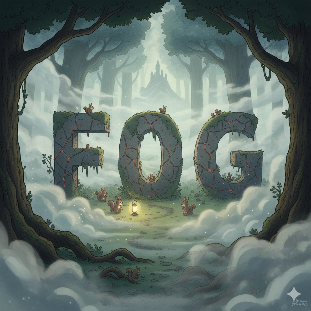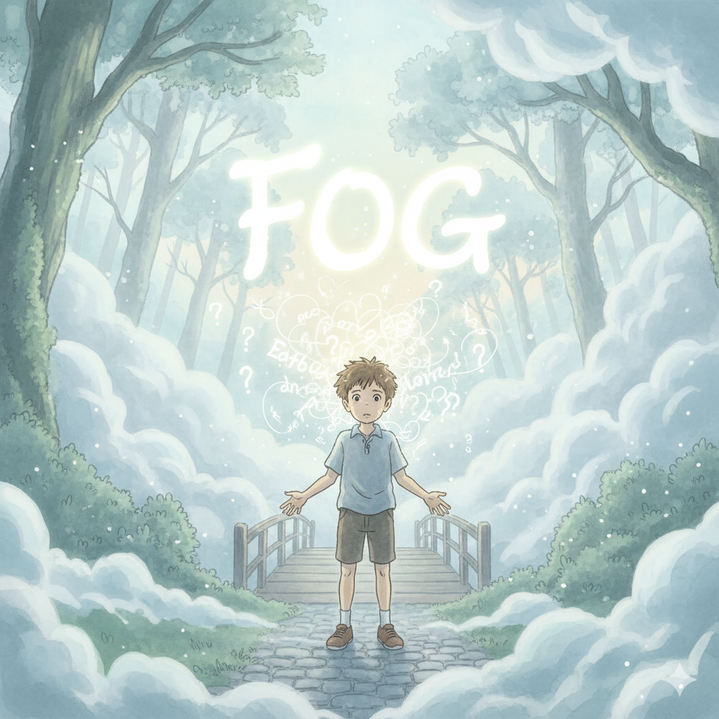 덴마크어 fog ("비, 폭풍우, 안개")에서 유래 → 스칸디나비아어 계열에서 '습한 대기'를 의미하는 단어와 연결 → 즉, 원래 **'습기나 연기로 인해 시야가 흐려지는 현상'**을 의미했음 → 이 의미가 현대 영어에서 '대기 중의 작은 물방울로 시야가 흐려지는 현상' (안개) 명사로 굳어졌어요. 나아가 물리적인 '흐릿함'에 비유하여 '정신적인 혼란이나 불명확한 상태' (정신적인 혼란, 흐릿함)의 의미를 가지게 되었어요.