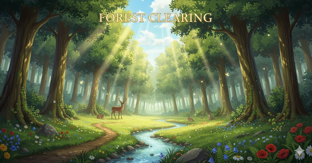 숲(forest)이 빽빽하게 둘러싼 가운데, '나무가 없고 공간이 비어 있는 작은 개방된 **지역'**을 의미합니다. '야생 동물들의 모임 **장소'**나 '여행자들의 휴식 **장소'**의 뉘앙스가 있습니다.