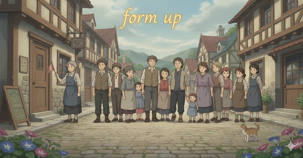 - *'form up'**은 군대나 단체에서 질서정연하게 정렬하거나 모일 때 사용되는 표현입니다.