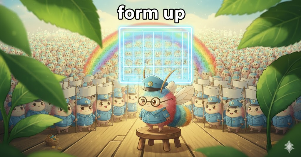 | up | 완전히, 제대로 | 부사로, '행위' '의' '완료' '나' '완벽함' '을' 강조. | '명시된' '행위'의 '결과'가 '규칙적인' '대형' '임을' 구체화. |