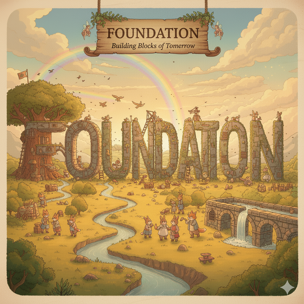 라틴어 fundare ("기초를 놓다")에서 유래 → 구 프랑스어 fondation을 거쳐 영어로 유입 → 즉, 원래 **'무언가의 바닥을 놓는 행위'**를 의미했음 → 이 의미가 현대 영어에서 '건물이나 사상의 가장 낮은 지지 부분' (기초, 토대) 명사로 굳어졌어요. 나아가 '새로운 것을 시작하는 행위'라는 의미에서 '조직이나 기관을 세우는 것' (설립)으로 확장되었고, 그렇게 세워진 '자선 단체' (재단)의 의미를 가지게 되었어요. 또한, '가장 기본적인 요소'라는 비유적 의미에서 **'어떤 생각이나 시스템의 근본, 근거'**로 사용됩니다. '바탕을 깔아주는' 이미지를 공유하며 '피부 바탕을 고르게 하는 화장품' (파운데이션)의 의미도 가지게 되었어요. 즉, **'지지대, 시작, 근본, 또는 바탕'**을 나타내는 핵심 다의어예요.