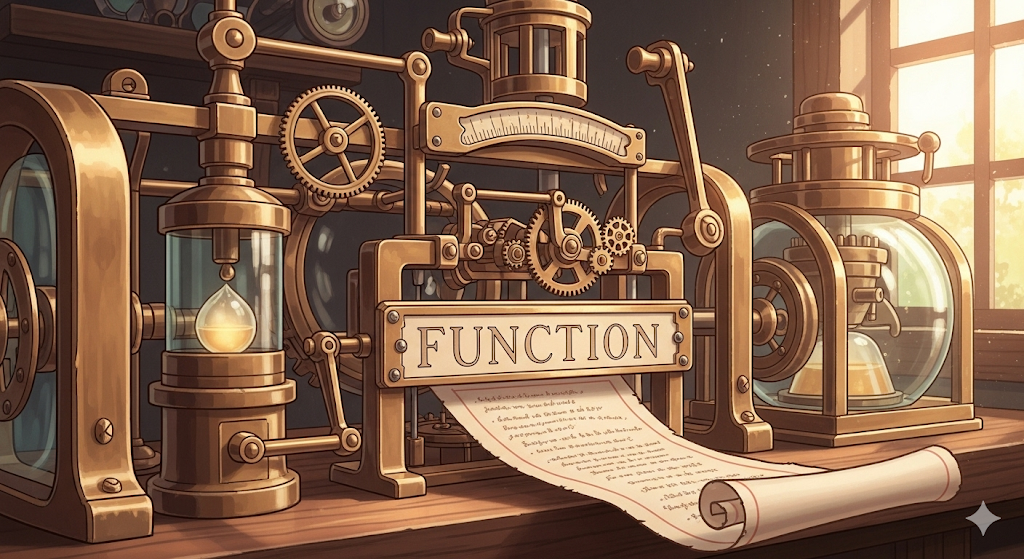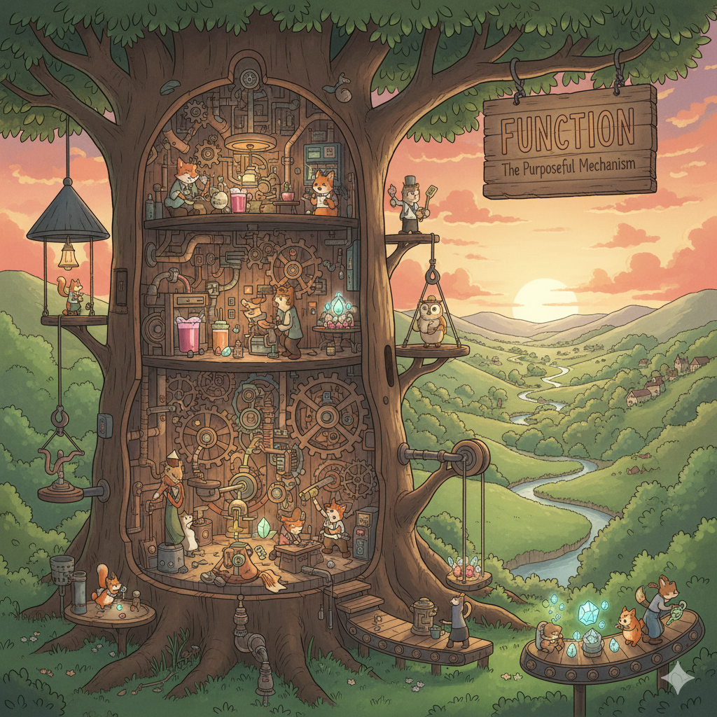 라틴어 functio ("수행, 실행")에서 유래 → 즉, 원래 **'일을 수행하거나 작용하는 것'**을 의미했음 → 이 의미가 현대 영어에서 '어떤 사물이나 사람이 하는 본래의 작용이나 임무' (기능, 역할) 명사로 굳어졌어요. 나아가 '특정한 작용을 하는 모임'이라는 의미에서 '특별한 목적을 위한 공식적인 모임' (행사, 의식)으로 확장되었고, '입력-출력 관계'라는 수학적 개념에서 **'함수'**의 의미를 가지게 되었어요.