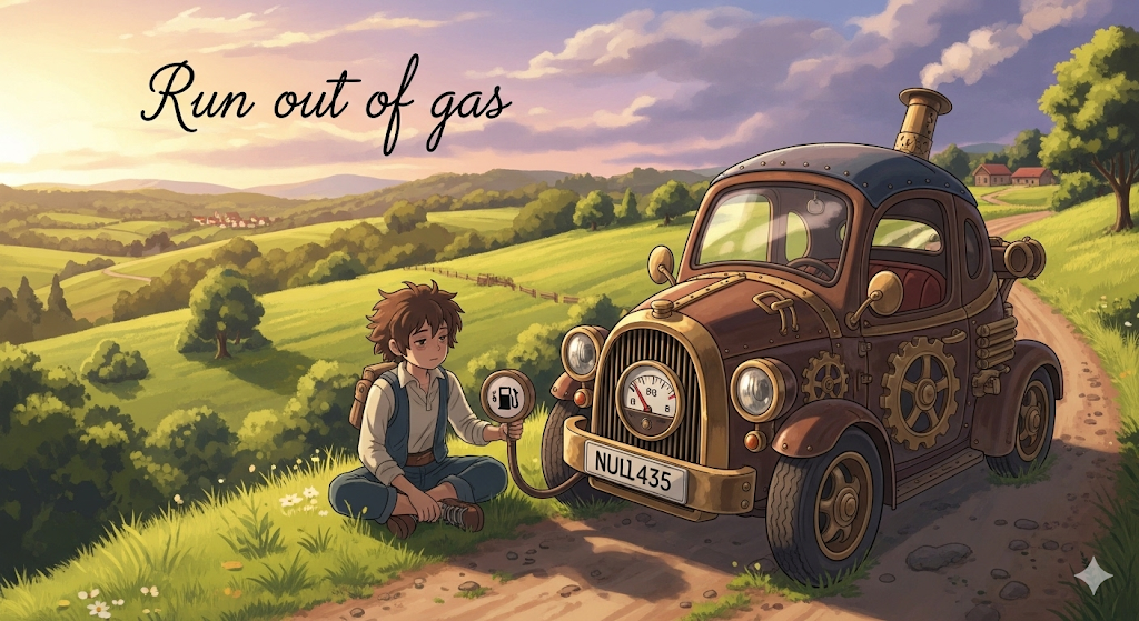 - 해설: 차량 연료가 바닥난 상황 또는 비유적으로 체력 소진.
