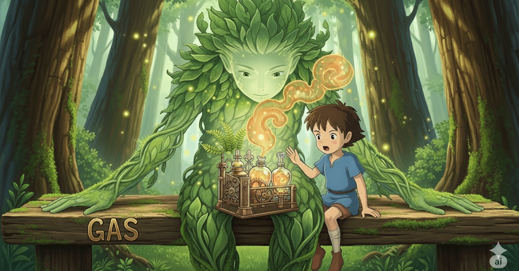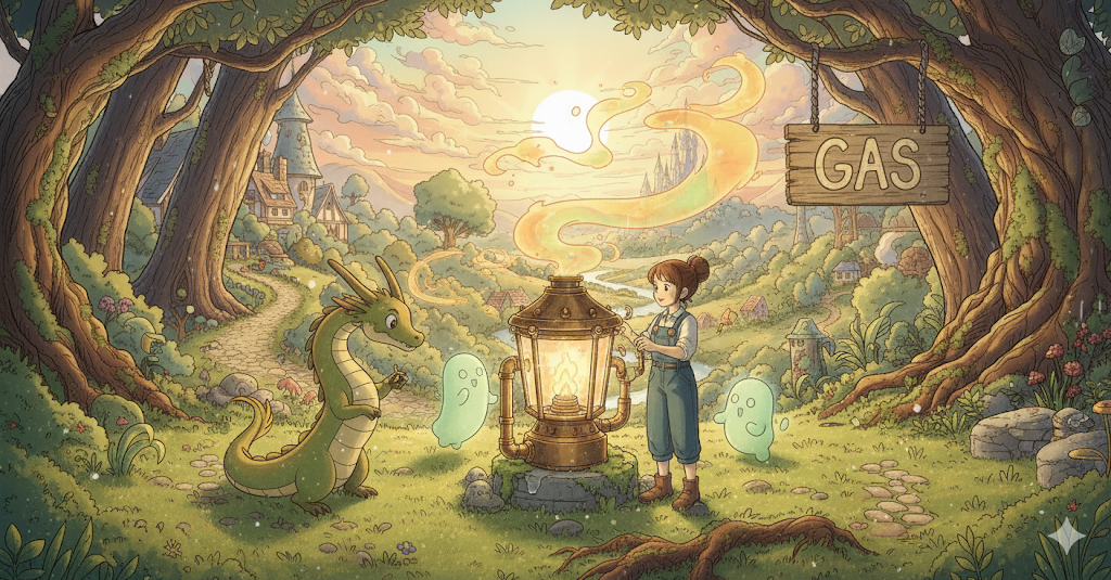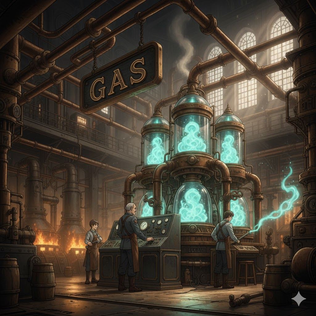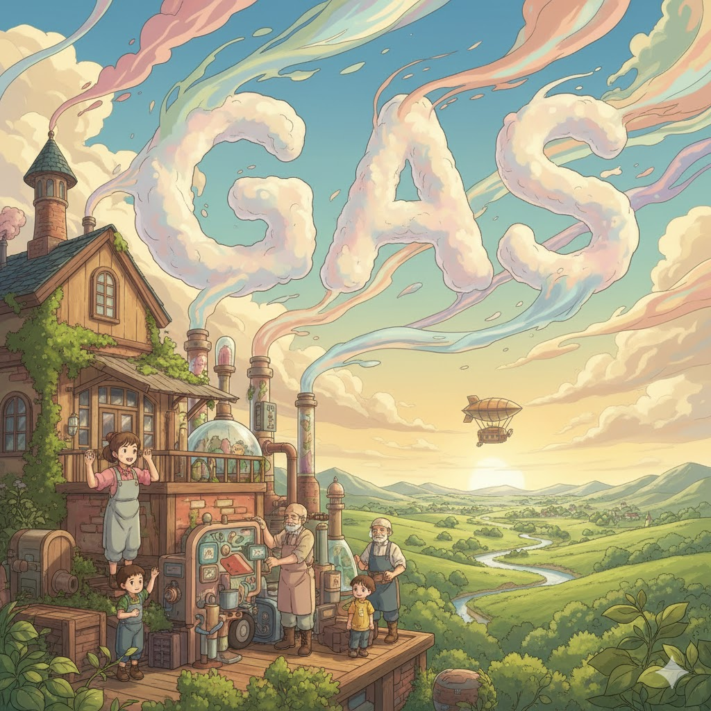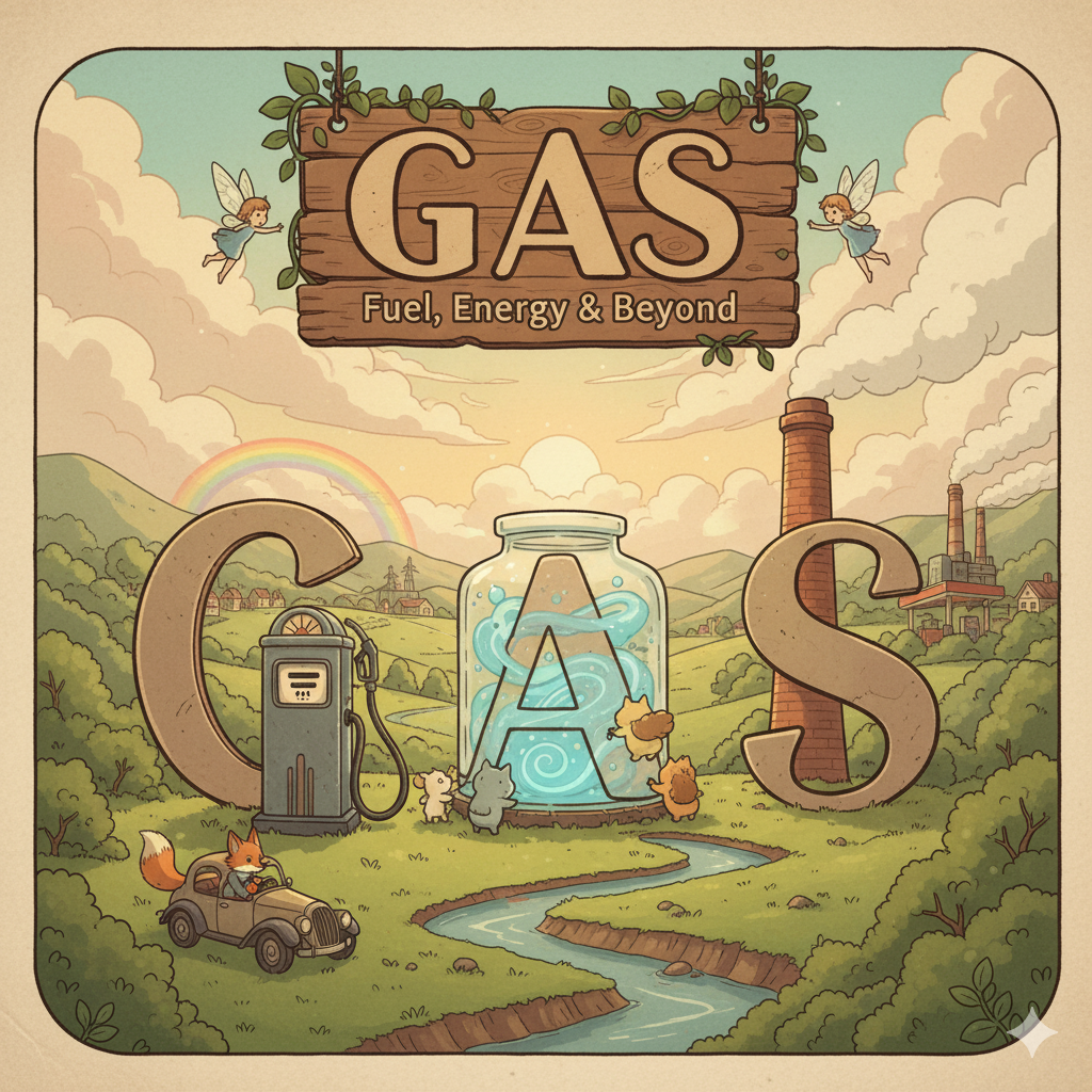 17세기 네덜란드 화학자 반 헬몬트(Jan Baptista van Helmont)가 그리스어 khaos ("공기, 빈 공간")에서 영감을 받아 조어 → 즉, 원래 **'형태 없는 물질'**을 의미했음 → 이 의미가 현대 영어에서 '형태와 부피가 일정하지 않은 물질의 상태' (기체) 명사로 굳어졌어요. 나아가 이러한 '기체 상태의 물질' 중 연료로 사용되는 것을 **'가스, 연료 가스'**로, 특히 미국에서는 자동차 연료인 **'휘발유'**를 뜻하게 되었어요. 생체 내에서 발생하는 기체도 같은 개념으로 **'(생체) 가스, 방귀'**로 확장되었어요.