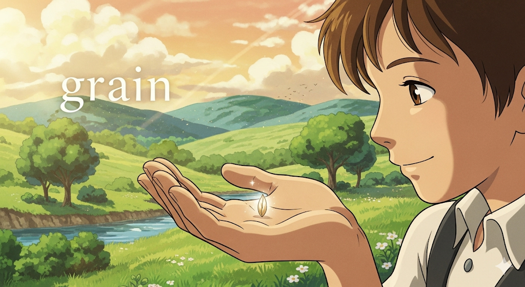 고대 영어 grān ("씨앗, 알갱이")에서 유래 → 즉, 원래 **'작은 씨앗이나 알갱이'**를 의미했음 → 이 의미가 현대 영어에서 '식용으로 재배되는 식물의 씨앗' (곡물, 낟알) 명사로 굳어졌어요. 나아가 이러한 '작은 입자'라는 개념이 확장되어 '모래, 소금 등의 아주 작은 조각' (알갱이, 아주 작은 조각)으로 사용되고, '조직의 세밀한 구조'라는 의미에서 '나무나 직물의 결' (결, 나뭇결, 직물 결)을 뜻하게 되었어요. 또한, '아주 작은 입자'의 비유적 의미로 **'아주 소량, 극소량'**을 나타내기도 합니다.