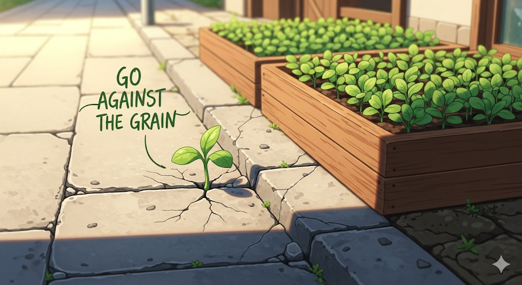 나무 결(grain)을 따라 자르는 것이 아닌, '결'에 거슬러 자르는 것'처럼, '자신의 본성(human nature), 개인의 성향(character), 또는 일반적인 관습이나 규칙에 반대되거나 어긋나는 **행위'**를 의미합니다. '주류 흐름에 저항하거나 반대하는 **것'**에 초점이 맞추어져 있습니다.