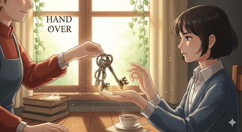 - 예문해석: 그는 새 주인에게 열쇠를 넘겨주었다.