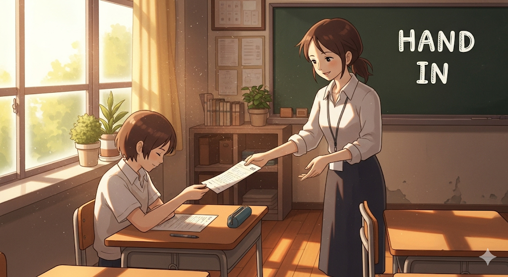 - "hand in"/"hand out"/"hand over"는 시험, 기사, 소설 내에서 문서, 물건, 사람 등을 이동·이양하는 상황 설명에 매우 자주 등장하므로 정확한 표현과 예문을 암기하는 것이 중요하다.