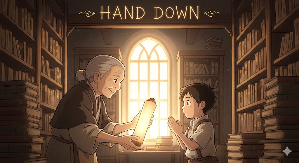 판결(judgment), 법률(law), 또는 전통(tradition)과 같은 '윗세대나 권위(authority) 있는 **주체'**에서 '아랫세대나 하급자에게 공식적으로 전달하거나 물려주는 **행위'**를 의미합니다. '권위 있는 **전달'**에 초점이 맞추어져 있습니다.