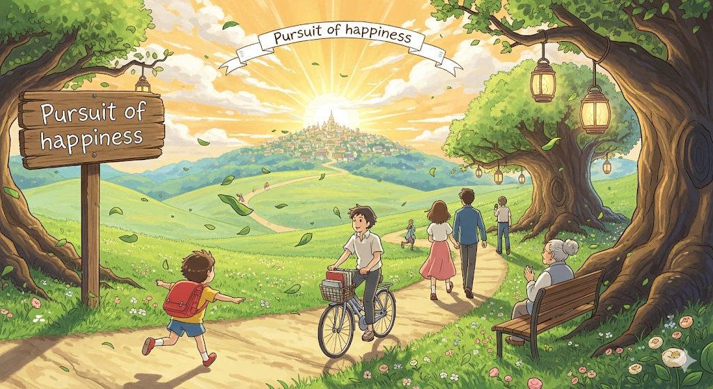 모든 개인(individual)이 '자신의 삶(life)에서 행복(happiness)을 찾고 추구할 **권리'**를 의미하는 철학적 및 정치적 개념입니다. '개인의 자유(individual freedom)와 노력(effort)이 보장되어야 하는 기본 **권리'**에 초점이 맞추어져 있습니다.