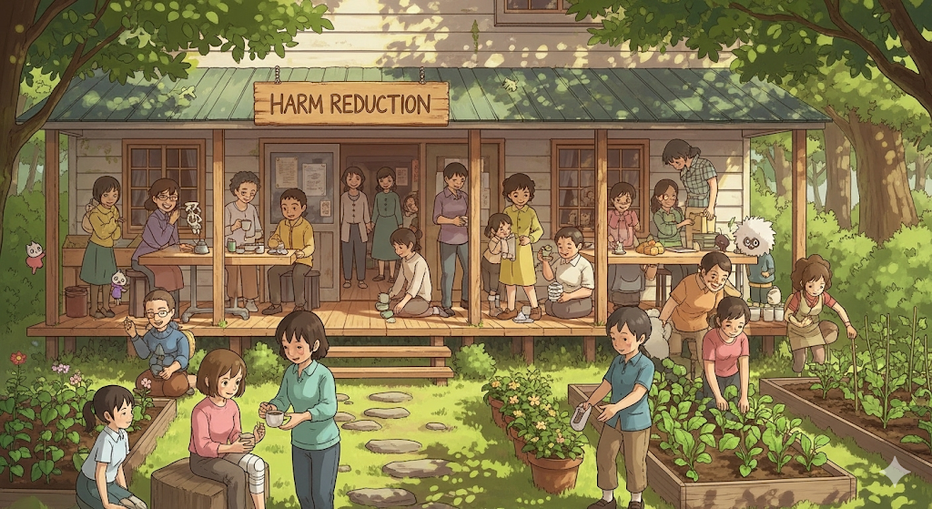 - 예문: Harm reduction programs are created to lower health risks for drug users.
