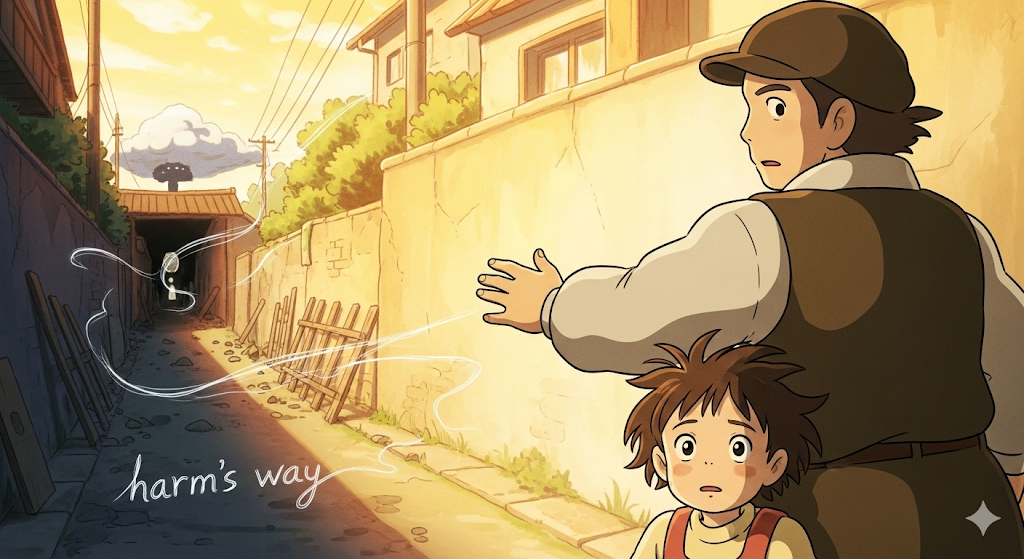신체적 위험(danger)이나 해(harm)가 발생할 수 있는 '경로(way)나 **상황'**을 의미합니다. '위험에 노출된 **상태'**를 나타내며, 주로 'out of harm’s way'(안전한 곳)로 사용됩니다.