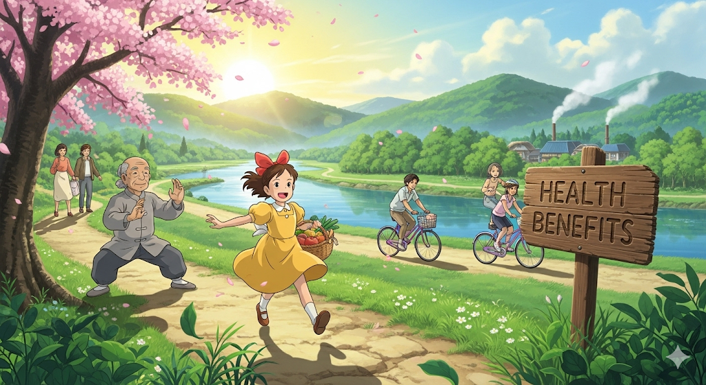 특정 행동(exercise), 식단(diet), 또는 정책이 개인의 건강(health)에 가져다주는 '긍정적이고 이로운 **결과'**를 의미합니다. '건강 **증진'**이라는 구체적인 이점(benefit)에 초점이 맞추어져 있습니다. (또한 건강 보험 혜택을 의미하기도 합니다.)