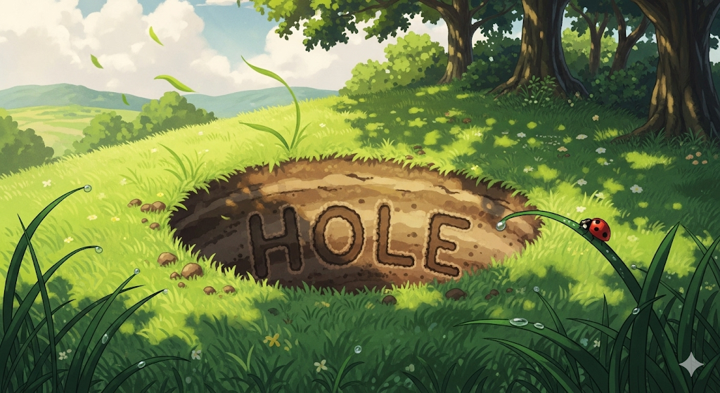 어떤 물체나 표면을 관통하거나 땅속으로 파인 **비어 있는 공간(구멍, 구덩이)**을 의미합니다. 물리적인 구멍 외에도, 계획이나 논리의 **'결함'**이나 **'곤경'**과 같은 비유적인 의미로도 사용됩니다. 핵심은 **'채워지지 않은 빈 공간'**입니다.