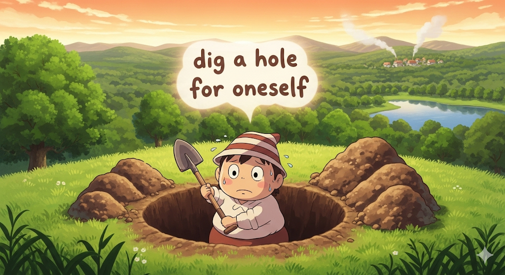 - He dug a hole for himself by lying about his experience. (그는 경력에 대해 거짓말을 하여 스스로 곤경에 빠졌다.)
