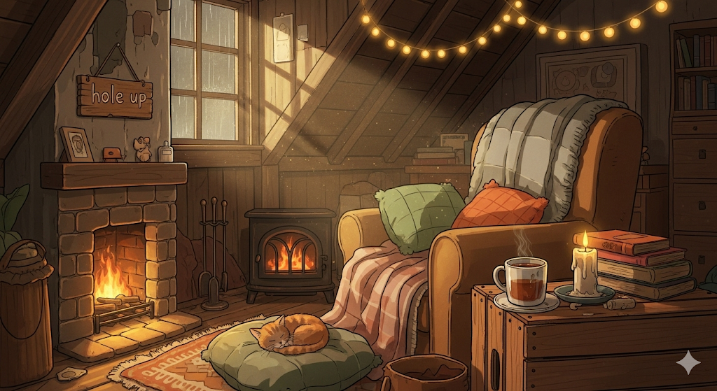 - 예문: They decided to hole up in the cabin until the storm passed.