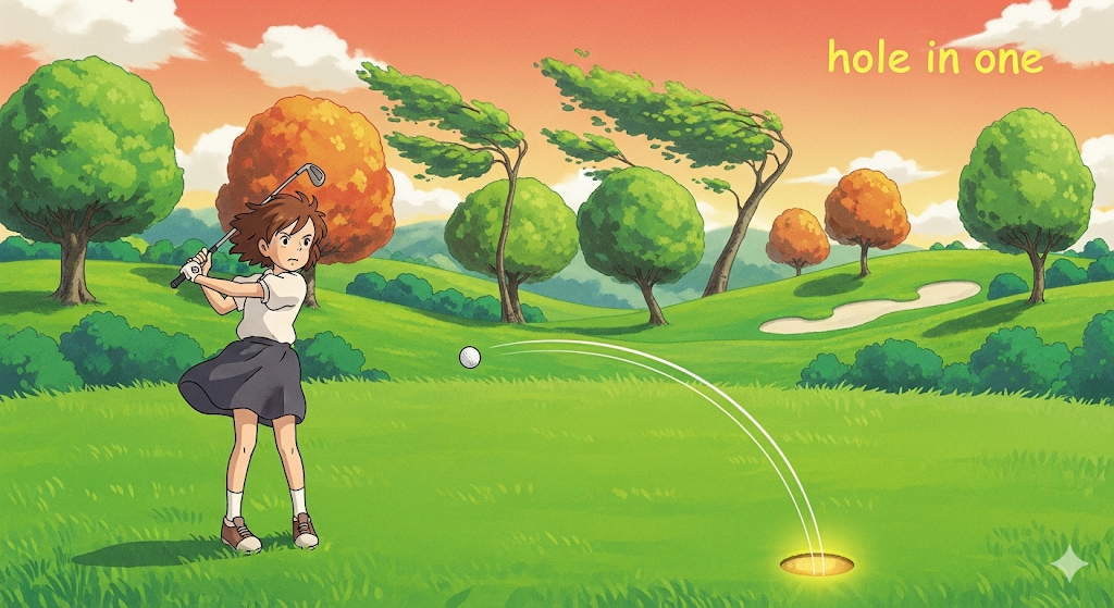- 해석: (골프) 한 번에 홀에 넣은 것, 행운