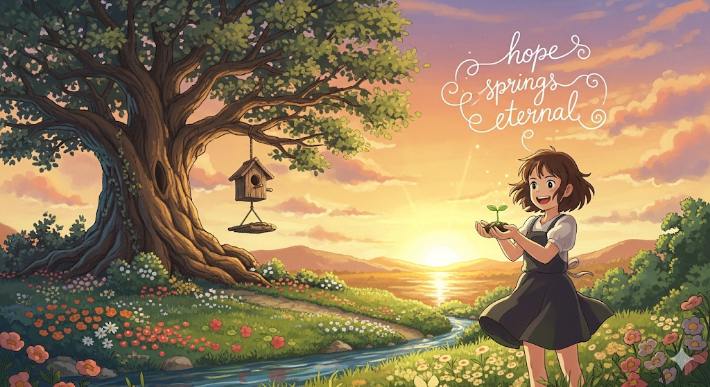 어떤 좋은 일이 일어날 것이라는 긍정적인 기대와 믿음을 의미합니다. 단순히 '바람(wish)'을 넘어, 실현 가능성이 있다고 믿는 낙관적인 감정에 초점이 맞추어져 있습니다. 절망(despair)과는 대조되는 개념으로, 어려움 속에서도 미래에 대한 긍정을 담고 있습니다.