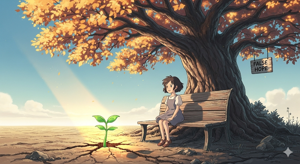 실제 사실(fact)이나 가능성에 근거하지 않은, '거짓(false)되거나 잘못된 기대(expectation)나 **희망'**을 의미합니다. '헛된 기대에 빠져 현실(reality)을 왜곡하는 **위험성'**에 초점이 맞추어져 있습니다.