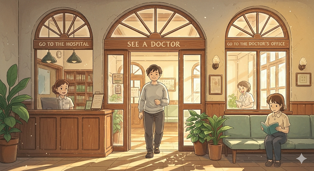 심각하거나 생명에 위협이 되지 않는 질병(disease)이나 상태(condition)에 대해 병원(hospital)을 찾아가는(visit) 행위를 의미합니다. '즉각적인 치료나 응급실(emergency room) 방문이 필요 없는 일상적인 **진료'**에 초점이 맞추어져 있습니다.