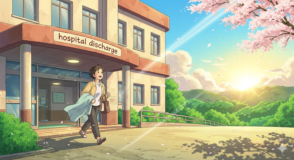 환자의 상태(condition)가 호전되거나 치료가 종료되어 병원(hospital)을 떠나도 좋다는 공식적인 허가(permission)와 그에 따른 절차를 의미합니다. '병원 안(inside)에서 밖(outside)으로 나가는 행위나 행정적 완료'에 초점이 맞추어져 있습니다.