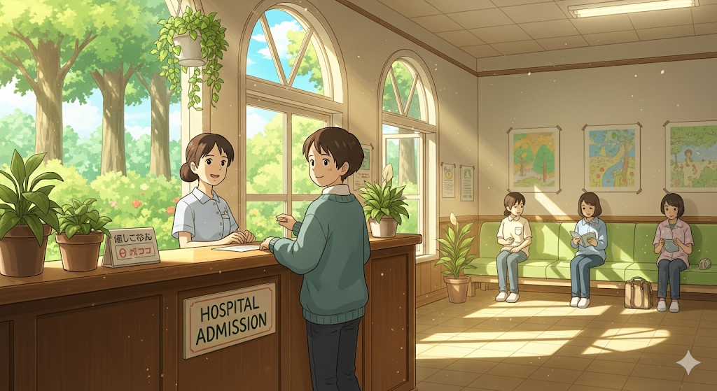 의사의 결정(decision)에 따라 환자가 치료나 관찰을 위해 병원(hospital)의 병동으로 공식적으로 들어가는 행위를 의미합니다. '입원이라는 **공식적인 절차'**에 초점이 맞추어져 있으며, 이는 상태(condition)가 심각하거나 장기적인 치료가 필요함을 시사합니다.