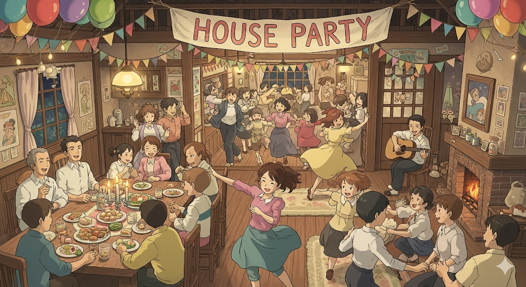 **개인의 집(house)이나 가정(home)에서 친목이나 축하(celebration)를 위해 소규모 또는 중규모로 여는 비공식적이고 사적인 모임(party)이나 행사(event)**를 의미합니다. **'친밀한 환경에서의 사교적인 모임'**에 초점이 맞추어져 있으며, '공식적인 행사(formal event)'와 대비됩니다.