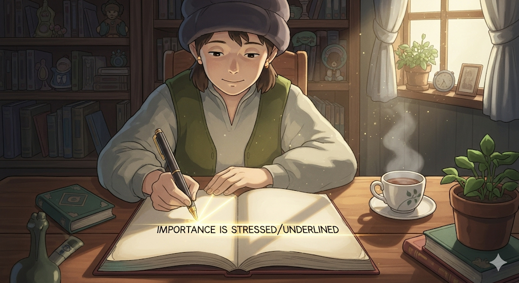 어떤 사안의 **'중요성(importance)'이 타인이나 상황에 의해 명확하고 강력하게 '강조되거나(stressed) 부각되는(underlined) 상태'**를 의미합니다. **'주목(attention)의 필요성이 외부적으로 강요되는 수동적인 상태'**에 초점이 맞추어져 있습니다. 'underlined'는 **'밑줄을 긋는 것'**처럼 확실히 표시된다는 비유적 의미를 가집니다.