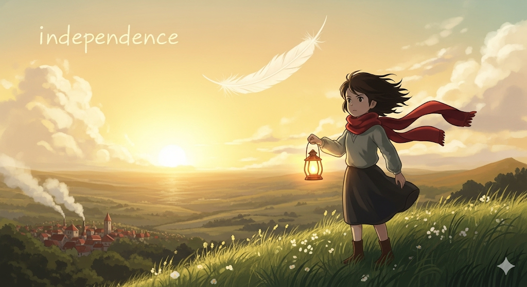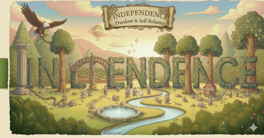 - (명사) 독립: 다른 사람, 국가, 또는 외부의 통제나 지원 없이 스스로 결정하고 행동하는 자유로운 상태.
