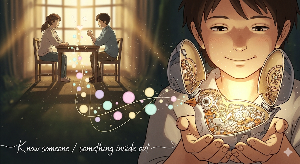 **사람(someone)의 성격(character), 동기(intention), 또는 어떤 사물(something)의 세부 사항(detail)이나 기능(function)에 대해 '모든 것(inside out)을 철저하게 알고 있는 상태'**를 의미합니다. **'완벽하고 깊이 있는 지식(knowledge)이나 이해(understanding)'**에 초점이 맞추어져 있으며, 종종 **'전문가적 숙련도(expert skill level)'**를 나타냅니다.