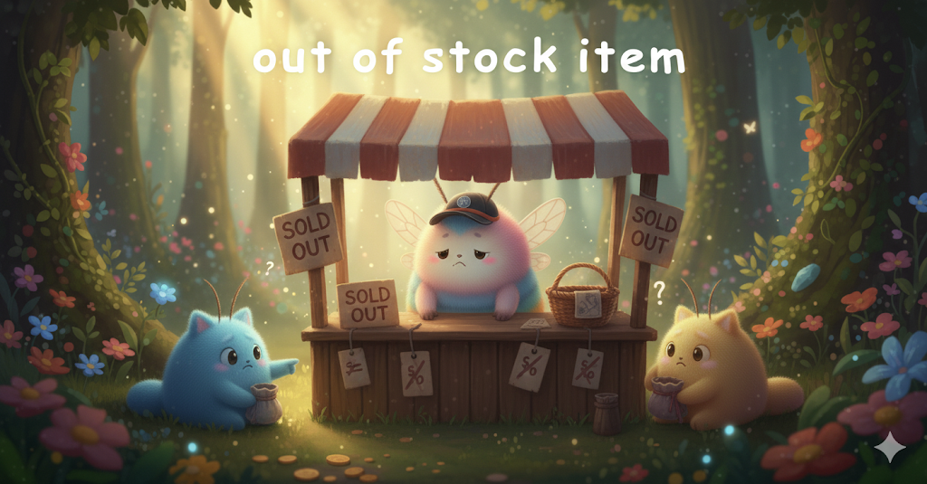 **현재 상점이나 창고에 재고(stock)가 남아 있지 않아 고객(customer)이 구매할 수 없는 물품(item)**을 의미합니다. **'일시적인 판매 불가 상태'**와 **'수요(demand)에 공급이 미치지 못하는 상태'**에 초점이 맞추어져 있습니다.