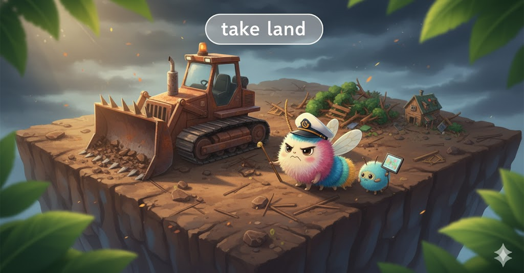 | take land | 땅을 차지하다 | 숙어구로, '점유'. | '토지' '를' '강제적' '으로나' '공식' '적' '으로' '획득' '하는' '행위' '를' '나타냄'. |