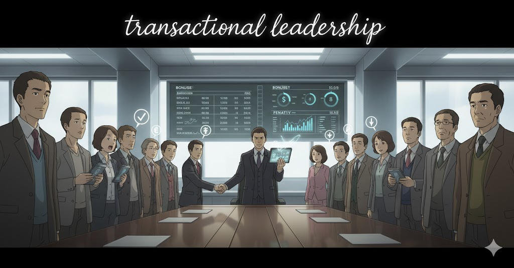 보상(reward)과 처벌(punishment)을 교환하는 계약적인 관계를 통해 구성원들을 통솔하는 리더십 스타일을 의미합니다. 리더가 명확한 목표와 기대를 설정하고, 구성원들이 목표를 달성하면 보상하고 실패하면 처벌하는 **'거래(transaction)'**에 초점을 맞춥니다. 효율적인 일상 업무 관리에 유용합니다.