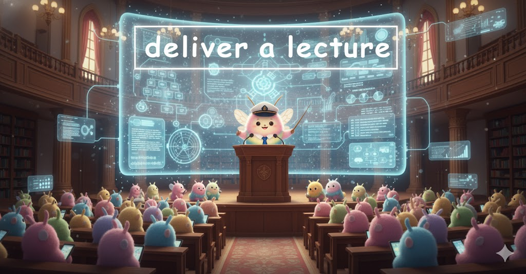 - 해석: 강의 내용을 청중에게 발표하는 행위 (give a lecture와 유사한 의미).
