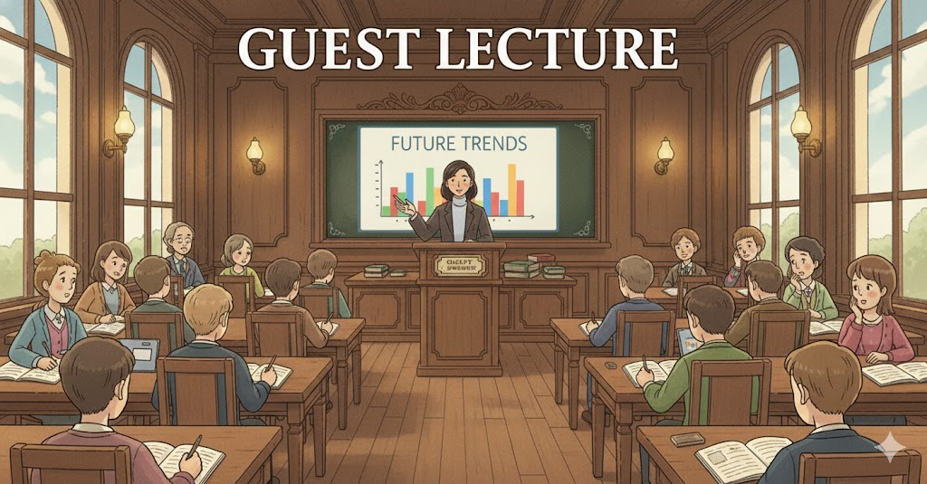 해당 기관(학교, 회사 등)의 정식 교직원이나 직원이 아닌, 외부의 전문가나 저명인사를 초대하여 진행하는 특별 강의를 의미합니다. **'외부 연사'**의 경험이나 전문 지식을 공유하는 것에 초점이 맞춰져 있으며, 정규 수업의 일환으로 또는 특별 event로 조직됩니다.