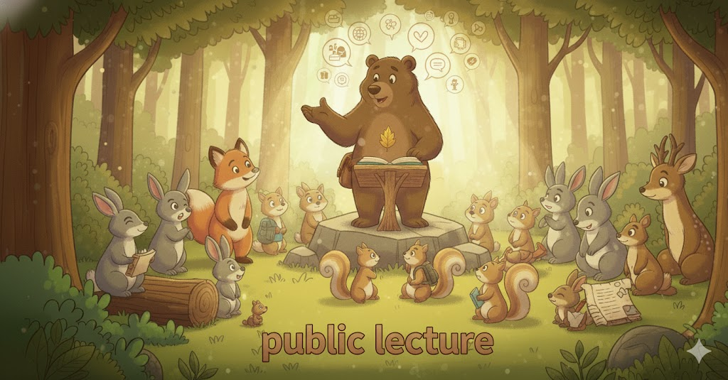 - 예문: She was invited to give a public lecture about climate change policy. (그녀는 기후 변화 정책에 관한 공개 강연을 하도록 초청받았다.)