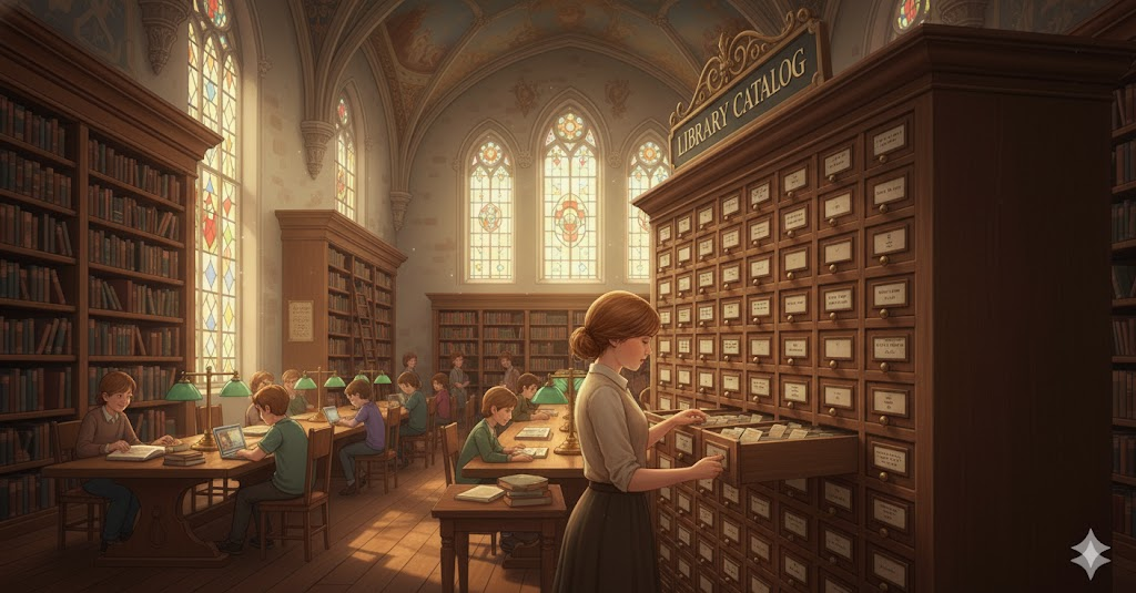 - 해석: 도서관이 소장하고 있는 모든 자료의 목록과 위치 정보를 제공하는 체계적인 시스템.
