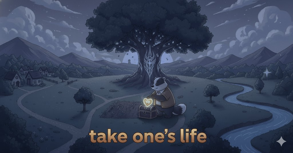 스스로의 목숨을 끊는 행위를 의미하는 완곡한 표현입니다. **'생명(life)을 스스로 가져가다(take)'**라는 직접적인 의미를 가지고 있으며, '자살하다(commit suicide)'보다 부드럽게 사용됩니다. **'자발적인 존재의 소멸'**이라는 무거운 뉘앙스를 가집니다.