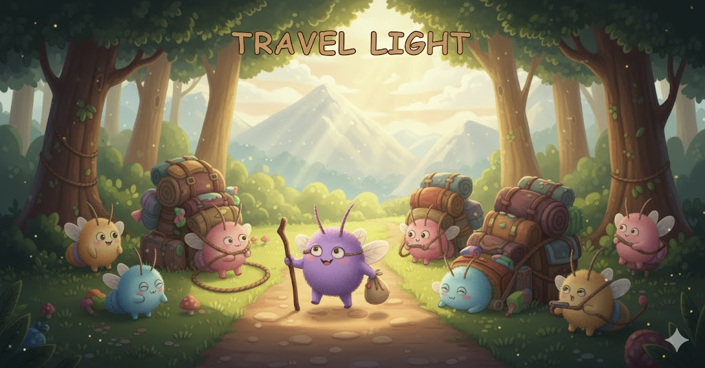 - 해석: 여행이나 이동 시 짐을 최소한으로 줄여 가볍게 다니다.