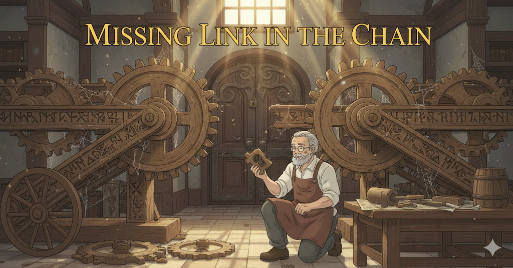 복잡한 일련의 과정(사슬)이나 논리에서 '가장 중요한 연결 고리'가 빠져 있어서 전체를 완성하거나 이해할 수 없는 상태를 의미합니다. 'missing link'와 유사하지만, **'전체 시스템의 연속성과 무결성을 저해하는 치명적인 부재'**에 초점을 맞추며, **'전체 체계'**를 강조합니다.