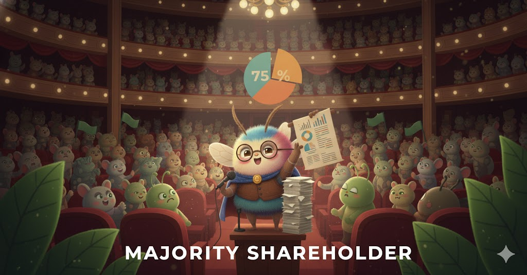 majority shareholder는 '주식회사에서' '가장 많은 수의 주식을' '소유하여' '가장 큰 의결권과 영향력을 가진' '개인이나 단체'를 의미하는 비즈니스 용어입니다. 이들의 결정이 회사의 경영 방향을 좌우합니다.