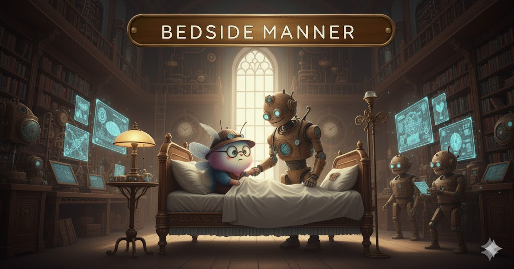 의사나 간호사 같은 의료 전문가가 **환자(patient)를 대할 때 보이는 태도나 방식(manner)**을 의미합니다. '기술적인 실력'보다는 '공감, 친절, 격려'와 같은 정서적인 측면에 초점이 맞추어져 있으며, 환자의 **신뢰(faith)**와 **쾌유(improvement)**에 큰 영향을 미칩니다.