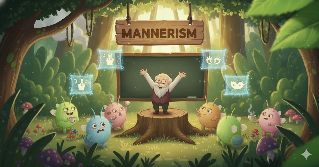 - 해석: 특정 개인에게 고유하고 반복되는 몸짓, 태도, 또는 말투. (예술에서는 매너리즘)