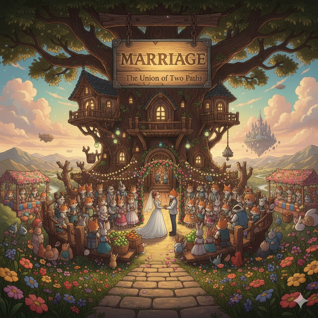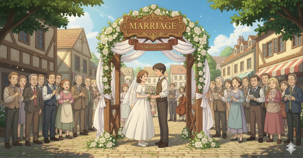 라틴어 maritare ("결혼하다")에서 유래 → 구 프랑스어 mariage를 거쳐 영어로 유입 → 즉, 원래 **'남편과 아내가 되는 상태나 관계'**를 의미했음 → 이 의미가 현대 영어에서 '두 개인이 영구적인 배우자 관계를 맺는 공식적인 행위나 상태' (결혼, 혼인) 명사로 굳어졌어요. 나아가 '결혼한 두 사람이 함께 살아가는 관계나 생활' (결혼 생활, 혼인 관계)을 뜻하게 되었고, '두 가지 이상의 별개의 요소가 합쳐져 하나가 되는' (결합, 융합) 비유적인 의미로도 확장되었어요. 즉, **'두 사람의 법적/사회적 결합 또는 그 관계'**를 나타내는 핵심 단어예요.