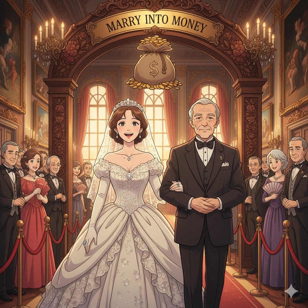 - 해석: 재정적인 이익을 얻을 목적으로 부유한 집안의 사람과 결혼하다.